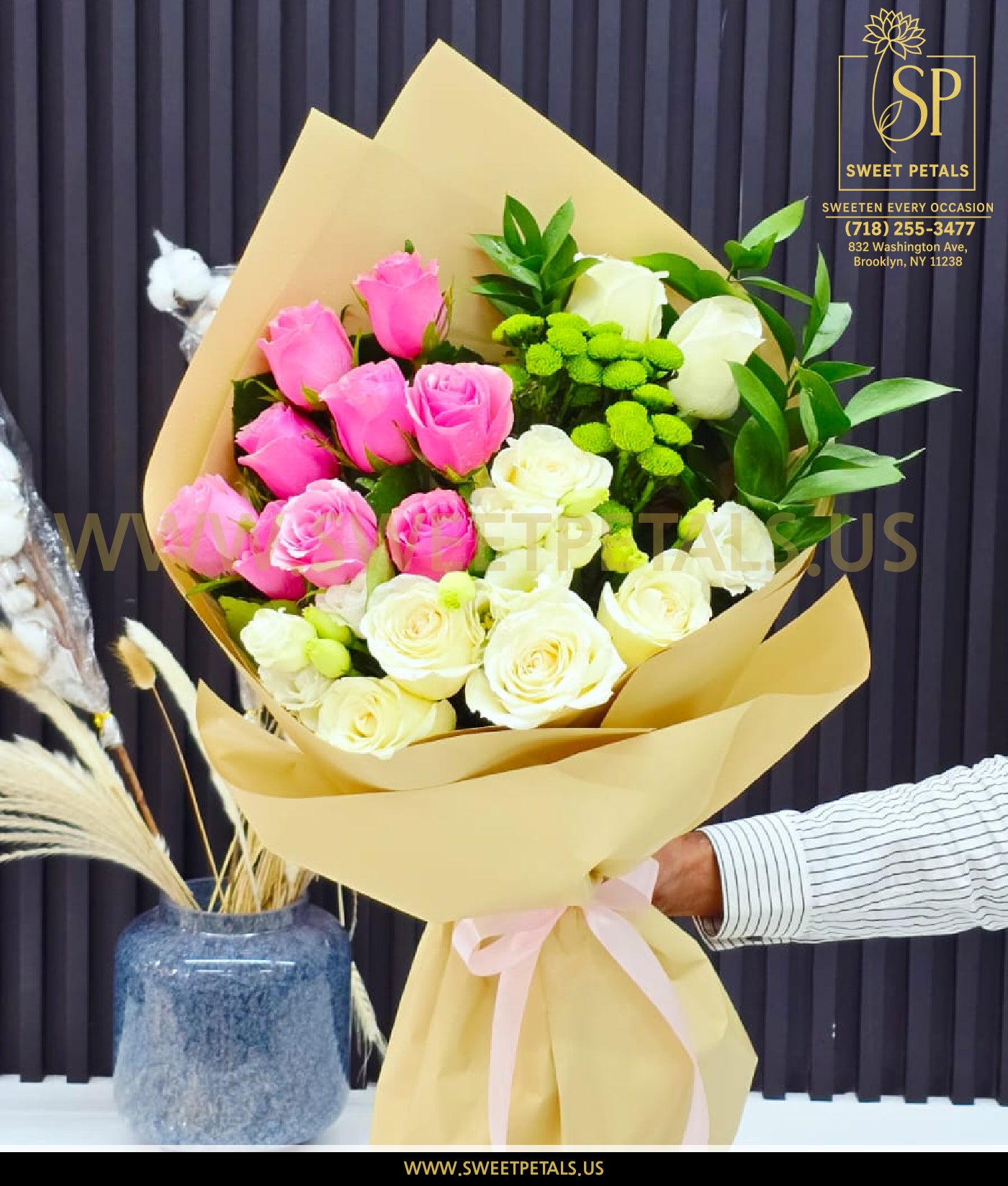 Flowers by SweetPetals – Brooklyn proudly presents the Pink & White Elegance Bouquet, a stunning arrangement that blends the purity of white roses with the vibrant charm of pink roses. Accented with fresh greenery and wrapped in luxury kraft paper with a satin ribbon, this bouquet is the perfect balance of sophistication and grace. Ideal for birthdays, anniversaries, weddings, or heartfelt surprises, it conveys love, admiration, and elegance in every bloom. Handpicked by our expert florists, this bouquet is designed to make any occasion unforgettable.