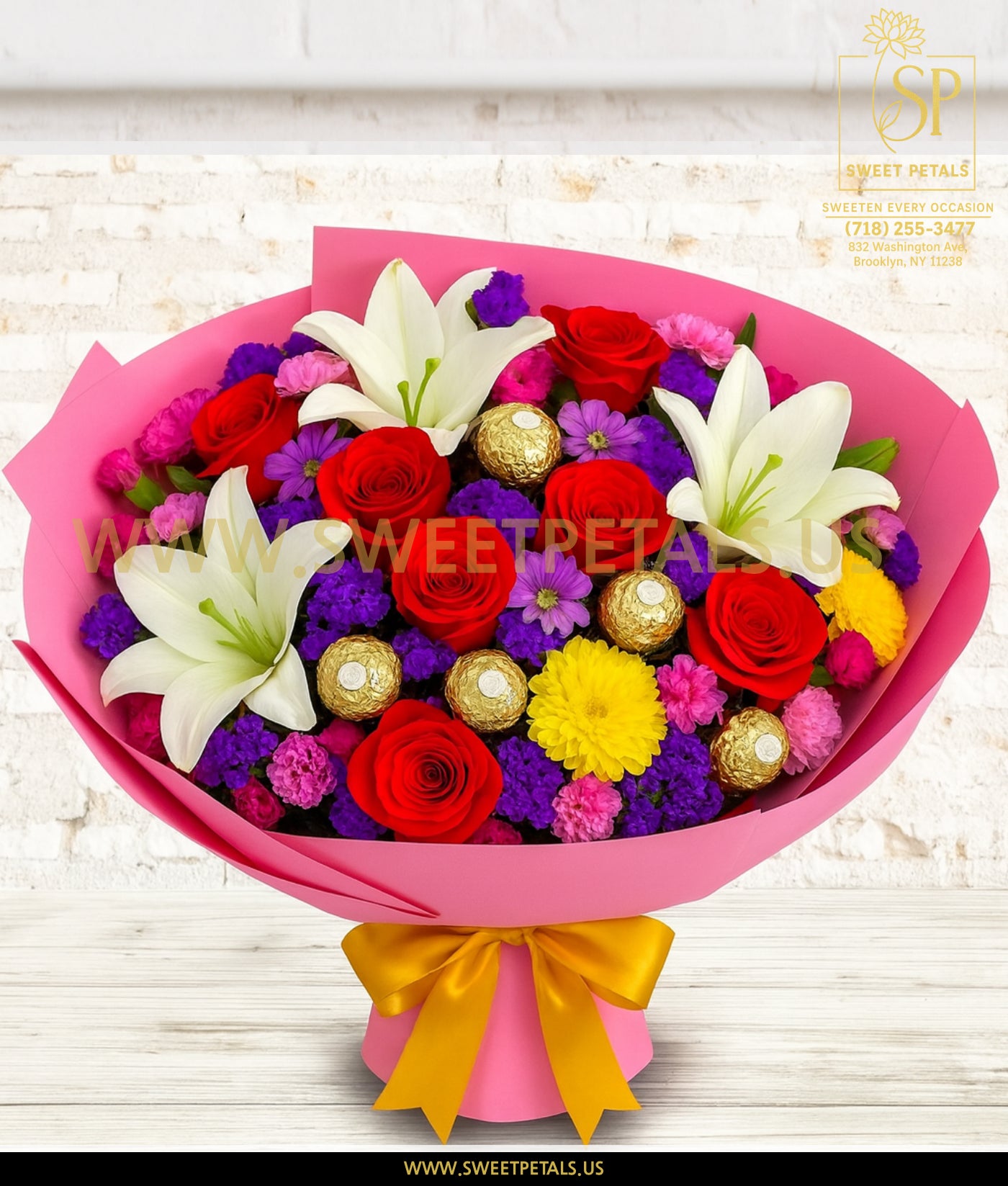 Flowers by SweetPetals – Brooklyn presents Sweet Radiance, an irresistible blend of elegance, color, and indulgence. This luxurious bouquet features velvety red roses, gold-wrapped Ferrero Rocher chocolates, white lilies, yellow chrysanthemums, and a vibrant mix of purple statice, pink spray carnations, and lavender daisies — creating a stunning harmony of colors and textures.